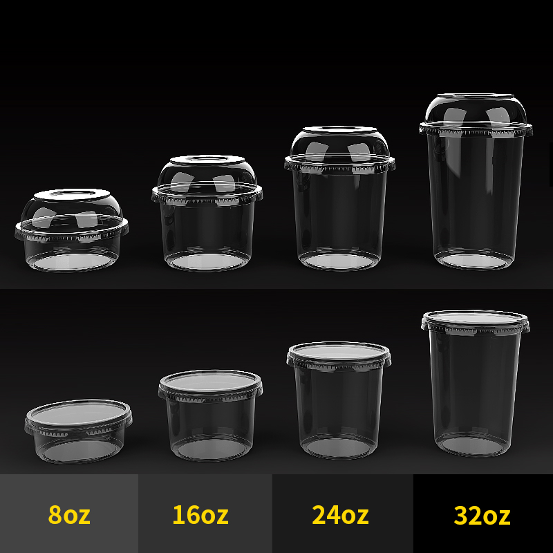 4.Transparência e aparência: Os copos de plástico PET têm boa transparência e podem exibir claramente os alimentos e bebidas no copo. Além disso, os copos plásticos PET podem ser personalizados por meio de impressão e adesivos para melhorar a imagem da marca e a competitividade no mercado.