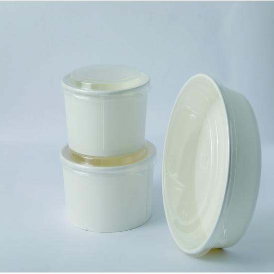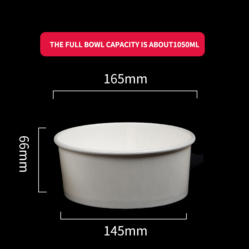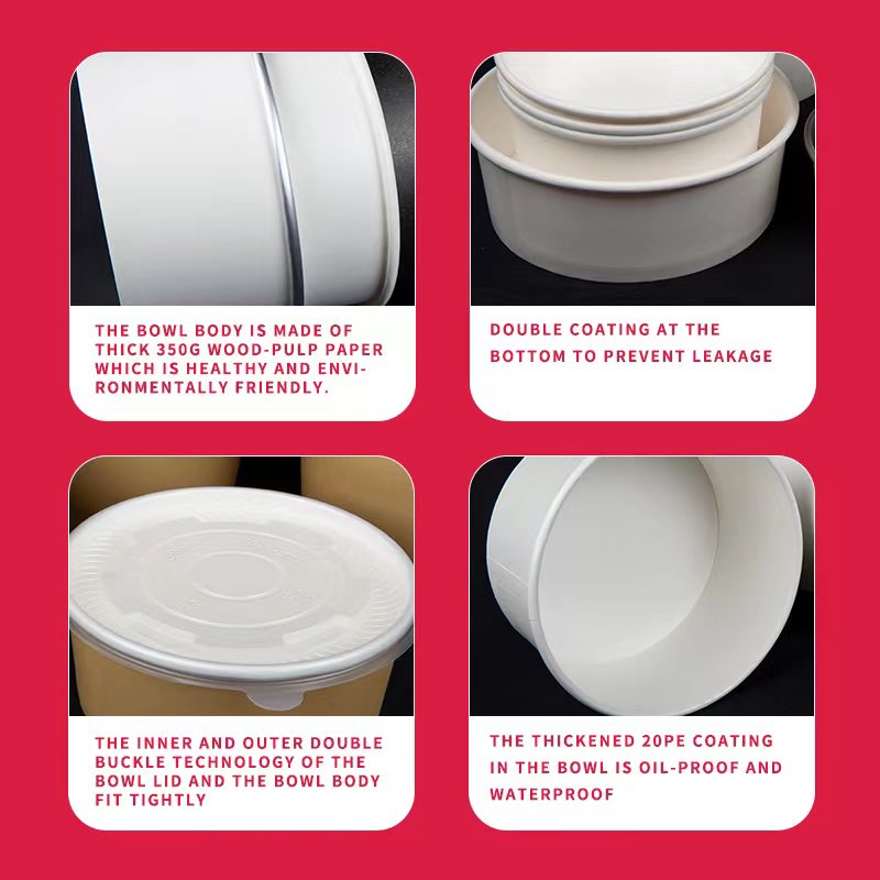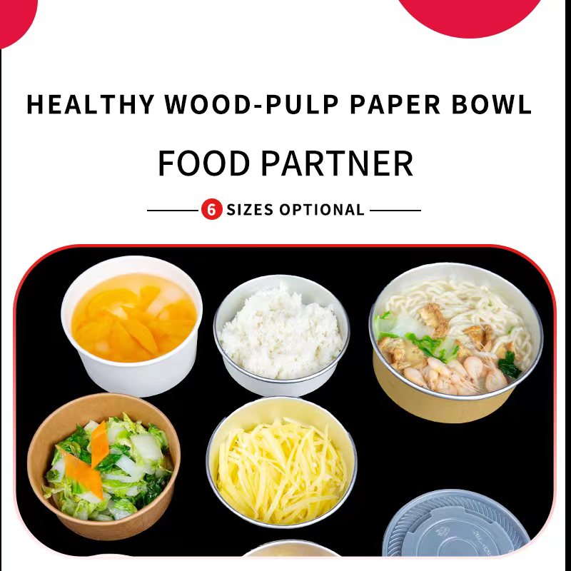 Temos uma tampa PET para cada tigela de papel. Pode evitar que os alimentos derramem.
